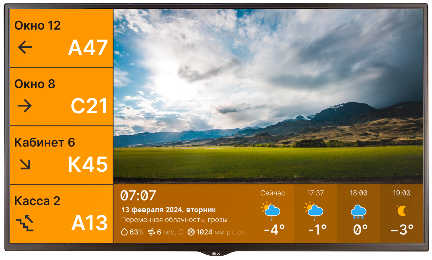 Модуль Digital Signage позволяет выводить медиафайлы на информационные табло — музыку, видео, картинки и ссылки на внешние интернет ресурсы.